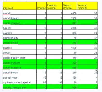 This table highlights Araceli Beauty’s keyword dominance, with over 10 high-volume keywords ranking in the top 3 on Google, including “araceli beauty” and “araceli makeup”.